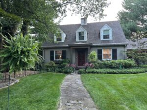The home’s original brick exterior now painted a soft green, and its distinctive mansard